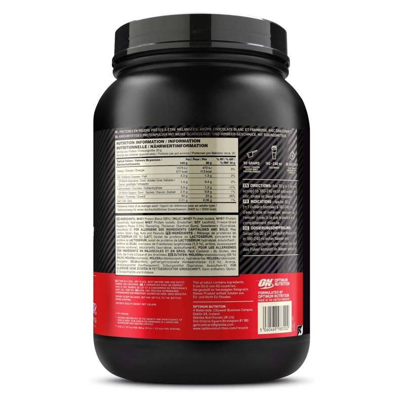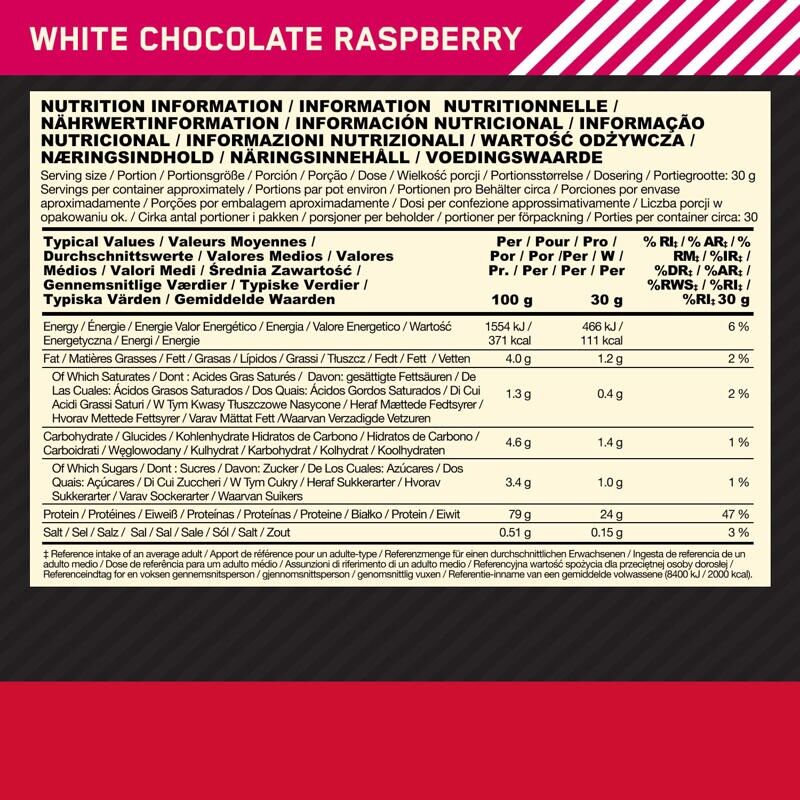 100% Whey Gold Standard je proteinska mješavina koja se sastoji najvećim dijelom od whey protein izolata (WPI), najkvalitetnijeg i najčišćeg oblika whey proteina koji postoji. Osim toga, sadrži i Hydrowhey - hidrolizirani whey izolat koji je jedan od najbrže djelujućih, a i jedan od najskupljih, te whey koncentrat. Koristeći whey protein izolat i hydrowhey kao glavne sastojke, uspješno je spojeno 24g najbržih proteina za mišićnu izgradnju sa puno manje masti, kolesterola, laktoze i ostalih stvari koje vam ne trebaju u svakom ukusnom serviranju Gold Standard 100% Whey-a. Nema sumnje da je ovo standard po kojem se mjere svi ostali proteini.