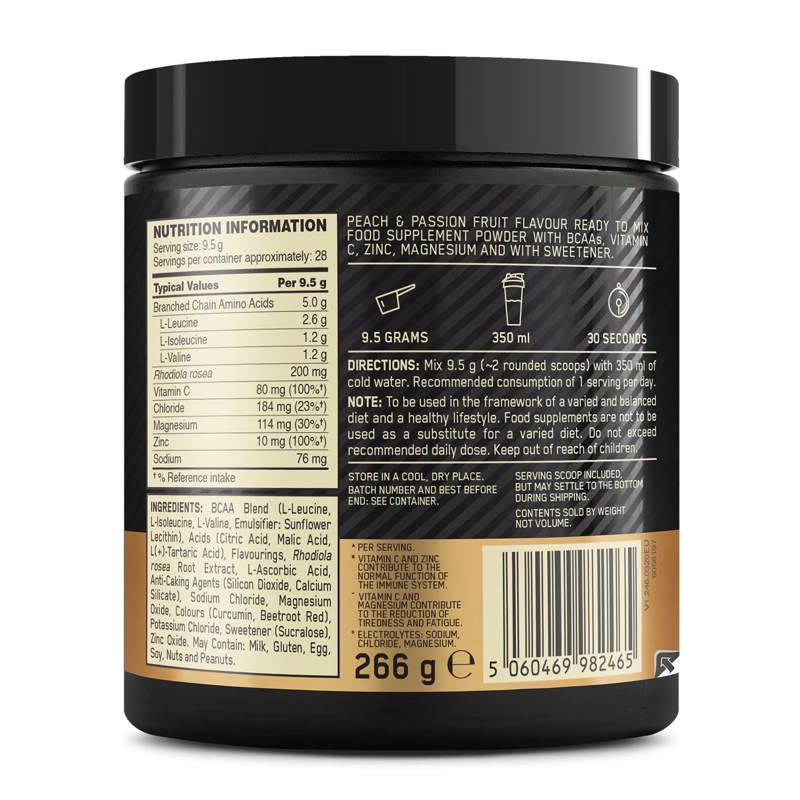 Sastojci: BCAA mješavina (L-leucin, L-valin, L-izoleucin, emulgator:sojin lecitin), regulatori kiselosti (limunska kiselina, jabučna kiselina, vinska kiselina), ekstrakt slada ječma (gluten), arome, kvasac, beta glukani (Wellmune®), ekstrakt korijena crvene rodiole (Rhodiola rosea)**, tvari za sprječavanje zgrudnjavanja (silicij dioksid, kalcijev silikat), natrijev klorid, kalijev klorid, magnezijev oksid, sladilo (sukraloza), Vitamin C (L-Askorbinska kiselina). Upozorenje: **Ne preporučuje se uzimanje duže od dva tjedna u kontinuitetu. Osobe koje uzimaju lijekove trebaju se prije uzimanja posavjetovati s liječnikom. Ne preporučuje se trudnicama i dojiljama.
