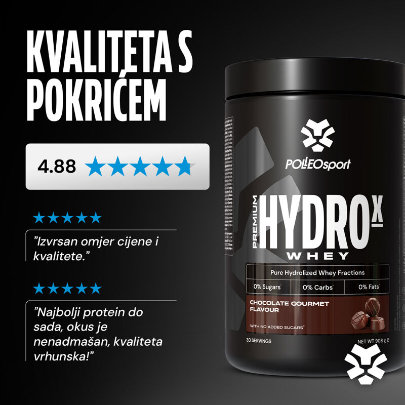 HR/BA Premium Hydrowhey - sirutkine bjelančevineu prahu, sa sladilom Okus: Bez okusa. Sastojci: Supreme mješavina sirutkinih bjelančevina {izolat SIRUTKINIH bjelančevina [iz mlijeka, emulgator (sojin lecitin)]}, hidrolizat SIRUTKINIH bjelančevina (iz mlijeka), zgušnjivač (celulozna guma). Alergeni: Može sadržavati tragove jaja, celera, sulfita, ribe, rakova i orašastog voća. Upute za upotrebu: Uliti 200 ml vode ili mlijeka u shaker, dodati 1 mjericu (30 g) praha, dobro protresti i konzumirati nakon treninga. . Uvjeti čuvanja: Čuvati na hladnom i suhom mjestu, zaštićeno od izravne sunčeve svjetlosti, pri temperaturi do 25 °C. . Najbolje upotrijebiti do kraja / LOT broj: Otisnuto na ambalaži.