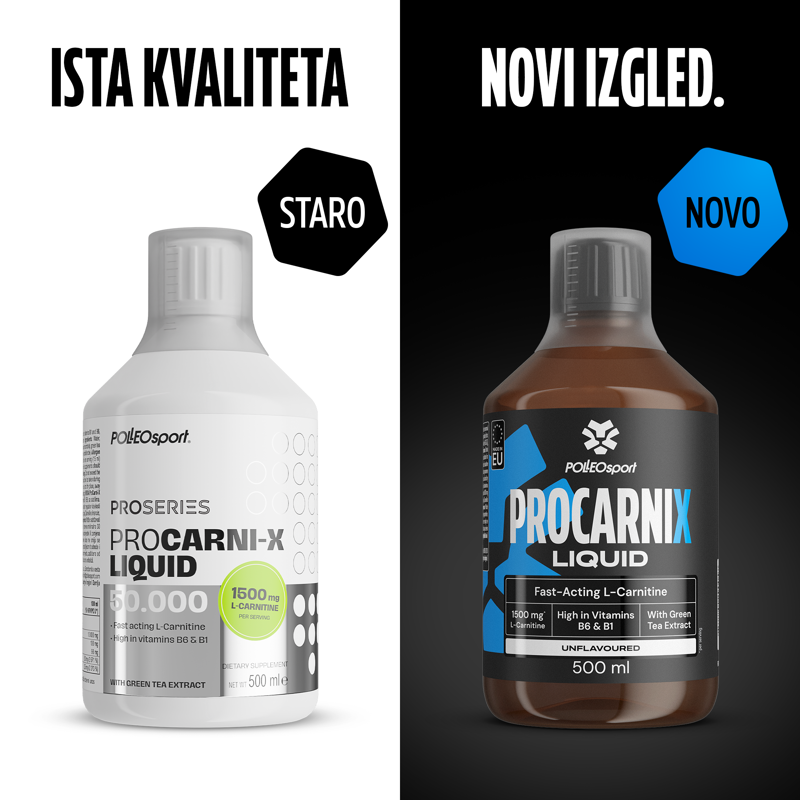 HR/BA ProCarni-X-Liquid 50.000 - Tekući dodatak prehrani s L-karnitinom, ekstraktom zelenog čaja i vitaminima B1 i B6, sa sladilima. Vitamini B1 i B6 doprinose normalnom metabolizmu stvaranja energije. Sadrži EGCG (6,18 mg/ serviranje). Sastojci: Voda, L-karnitin, regulator kiselosti (limunska kiselina), sladila (ksilitol, sukraloza), konzervans (kalijev sorbat), ekstrakt zelenog čaja [Camellia sinensis (list), sadrži 41,23 % epigalokatehin - 3 - galata (EGCG)], vitamin B6 (piridoksin-hidroklorid), vitamin B1 (tiamin-hidroklorid). Alergeni: Može sadržavati tragove mlijeka, soje, gorušice i celera. Upute za upotrebu: Popiti jedno serviranje (15 ml) dnevno minimalno 30 minuta prije treninga. Dobro protresti prije upotrebe. Napomena: Dodatak prehrani nije nadomjestak ili zamjena uravnoteženoj prehrani. Čuvati od dohvata male djece. Upozorenja: Preporučene dnevne doze ne smiju se prekoračiti. Prekomjerna konzumacija može imati laksativni učinak. Proizvod ne biste trebali konzumirati a ko istog dana uzimate druge prozivode koji sadržavaju zeleni čaj. Proizvod ne bi trebale konzumirati trudnice, dojilje ni djeca mlađa od 18 godina. Proizvod se ne bi trebao konzumirati na prazan želudac. Uvjeti čuvanja: Čuvati na hladnom i suhom mjestu, zaštićeno od izravne sunčeve svjetlosti, pri temperaturi do 25 °C. . Najbolje upotrijebiti do / LOT broj: Otisnuto na ambalaži.