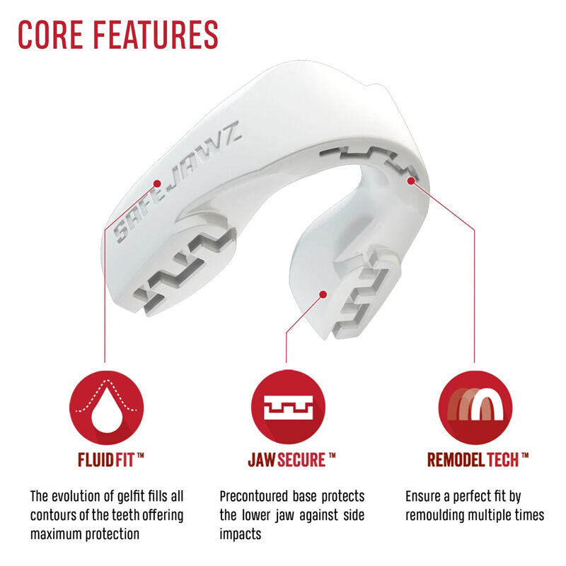 Njegova Fluid Fit™ tehnologija znači da SAFEJAWZ® štitnici imaju super-tanki profil i izvrsne retencijske kvalitete. Štitnik će se praktično zakačiti na zube i udobno prijanjati, tako da disanje, razgovor i pijenje neće biti problem.