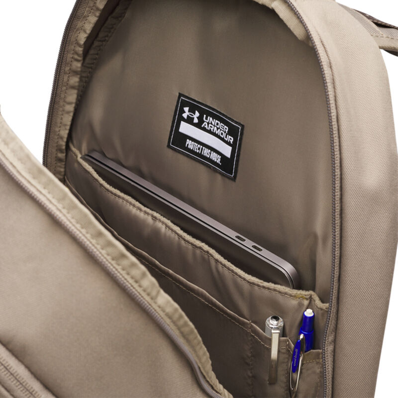 Vodootporna UA Storm tehnologija štiti tvoje stvari od vremenskih uvjeta. LEVELED sustav naramenica omogućuje ravnomjerno podešavanje za optimalnu raspodjelu težine. Materijal je presvučen mekim završnim slojem za dodatnu izdržljivost. Podstavljeni pretinac štiti prijenosno računalo do veličine 16". Sekundarni pretinac može se koristiti za obuću ili prljavo rublje. Prednji džepovi sa zatvaračem i bočni džep za bocu (do 32oz) nude organizirano spremanje. Podesiva i uklonjiva UA kopča na naramenici sprječava pad torbe prilikom nošenja s drugom torbom.
