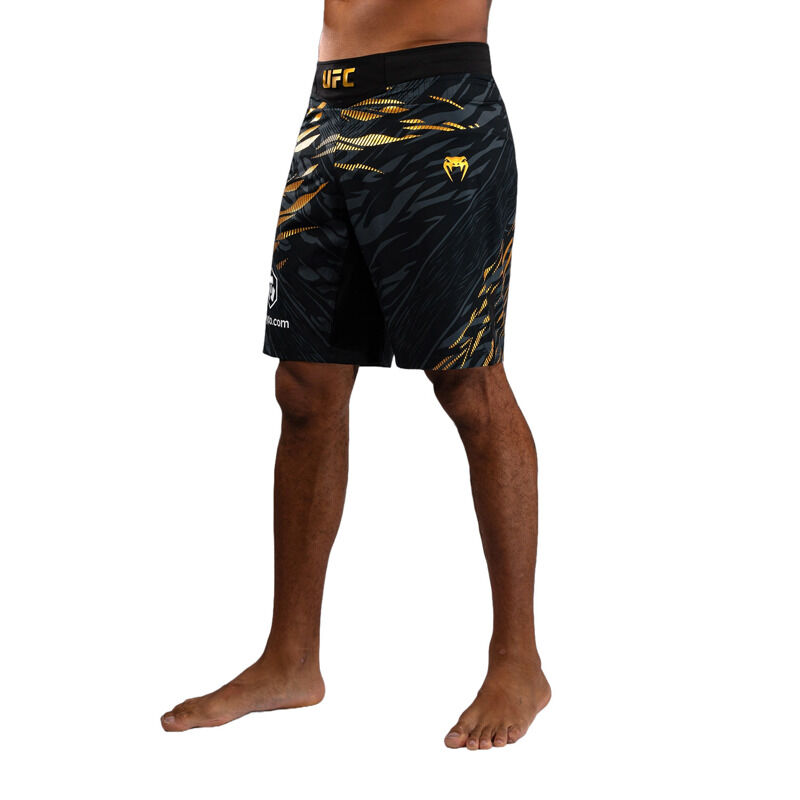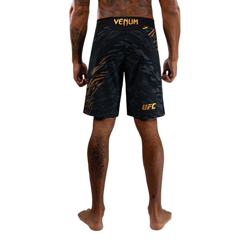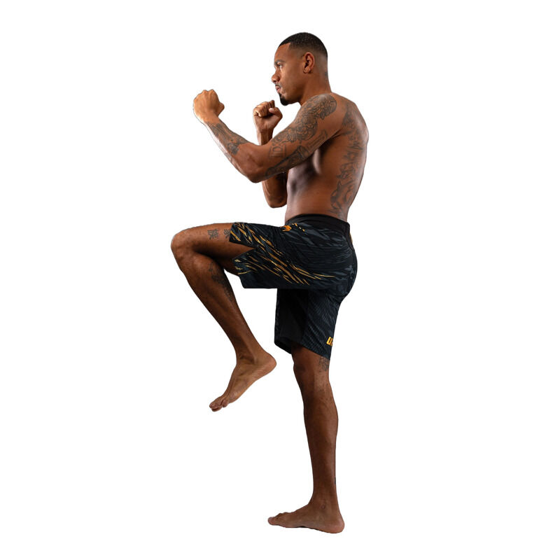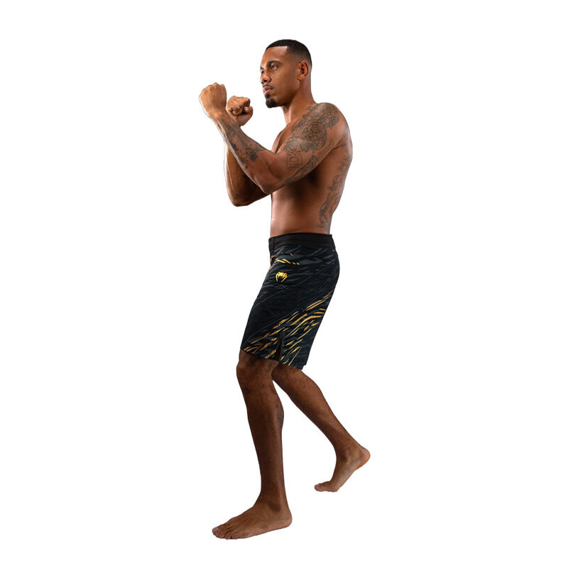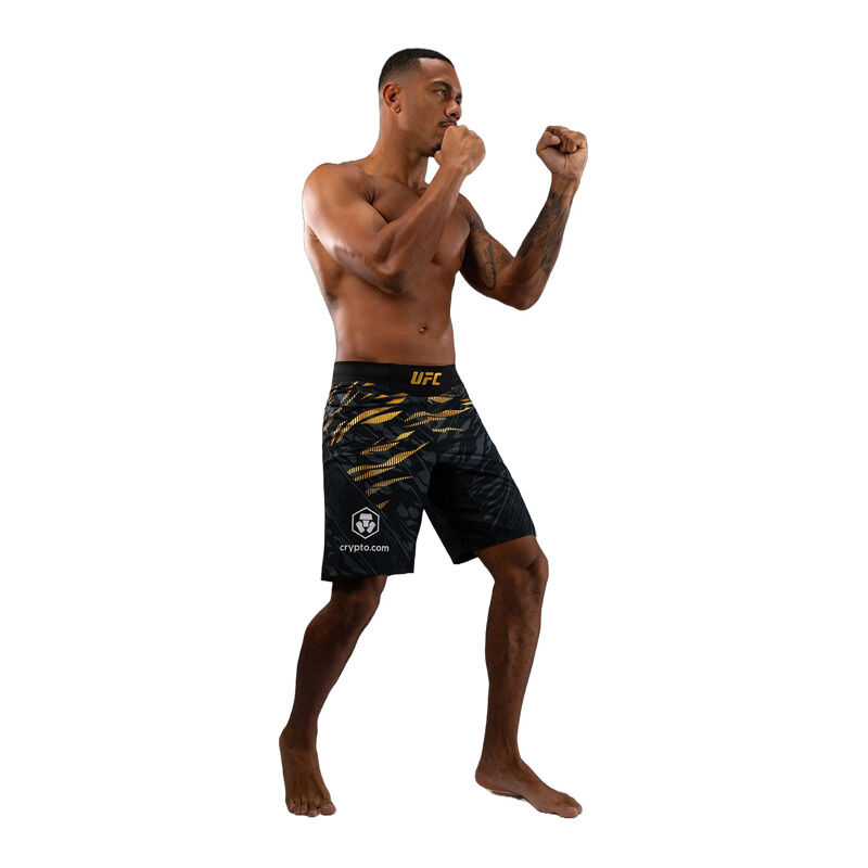 Predstavljamo UFC Fusion by Venum, kompletnu kolekciju odjeće i dodataka koja spaja sofisticirane performansne tkanine i primitivne dizajnerske elemente. Svaki komad iz ove autentične UFC Fight Night kolekcije stvoren je kako bi zadovoljio potrebe UFC boraca, koristeći izuzetno izdržljive, prozračne tkanine i promišljene detalje. Jacquard animal print poziva sportaše da se povežu sa svojim najdubljim primitivnim instinktima kako bi pobijedili u Oktogonu. Dizajnirane za mobilnost i udobnost, ove long-fit kratke hlače u crno-zlatnoj boji imaju termo-zalijepljene bočne proreze koji omogućuju veću slobodu kretanja tijekom stajanja i borbe na tlu. Tkanina je lagana, izdržljiva i fleksibilna, dok elastični pojas osigurava sigurno nošenje – idealne hlače za borilačke sportove. Ova crno-zlatna boja rezervirana je za UFC prvake. Kada su ulogu najveći, povežite se s primitivnim instinktima.