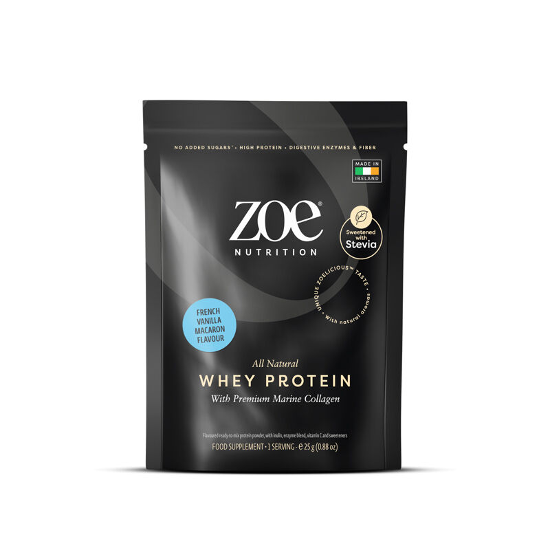 Pažljivo osmišljen za aktivne žene, zoe Nutrition Whey Protein napravljen je na bazi hidroliziranog koncentrata i izolata sirutke, s dodanim ribljim kolagenom, inulinom, probavnim enzimima i vitaminom C. Zoe Whey protein ima tek 112 kalorija po serviranju, iznimno se brzo apsorbira, opskrbljuje tijelo aminokiselinama te potiče sintezu proteina.